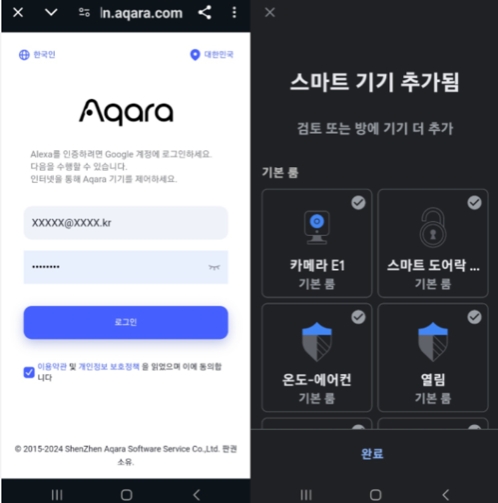 Aqara Home 선택 >> 계속 > Aqara Home앱 로그인 창 >> 우측 상단 “계정 영역을 선택하세요” >> “대한민국” >> Aqara Home 앱 이메일 ID/비밀번호 입력