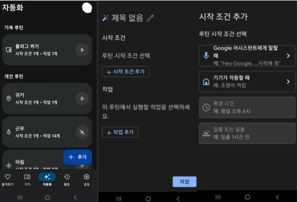구글홈 앱 하단 >> 자동화 >> “+ 추가” 선택 >> “+시작 조건 추가” >> 기기가 작동할 때 선택
