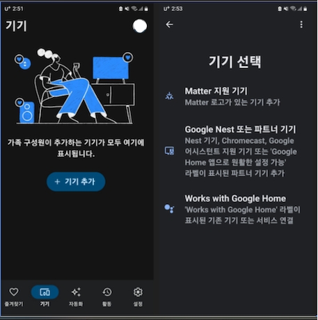 구글홈 앱 하단 기기 선택 >> ‘+ 기기추가’ 버튼 클릭 >> 기기 선택 >> Works with Google Home 선택