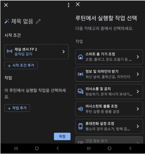 “+ 작업 추가” 선택 >> 루틴에서 실행할 작업 선택 >> 스마트 홈 기기 조정
