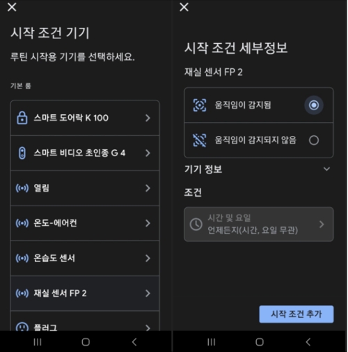 시작 조건 기기 선택 >> 재실 센선 FP2 선택 >> 시작 조건 세부 정보 >> 움직임이 감지됨 선택