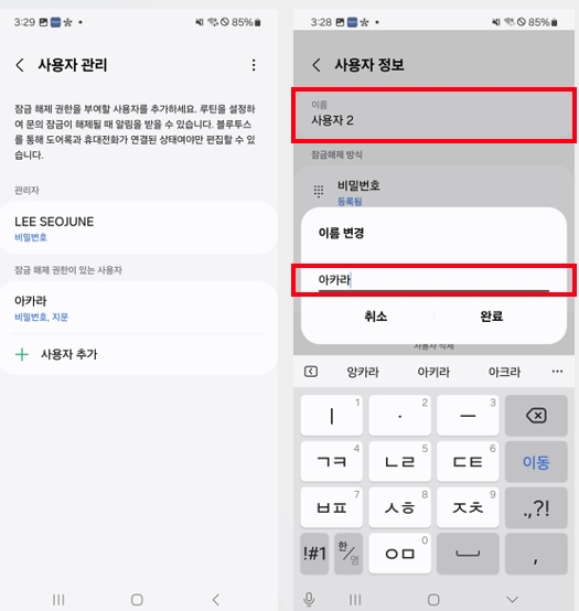 사용자를 선택한 상태에서 “이름”을 선택하면 이름을 변경할 수 있습니다.