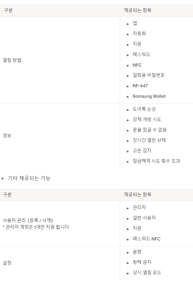 비정상 상태 알림(열림 시도 5회 실패, 고온 경보 등), OTA 기반의 펌웨어 업데이트 등 일부 기능은 순차적으로 업데이트 될 예정입니다.