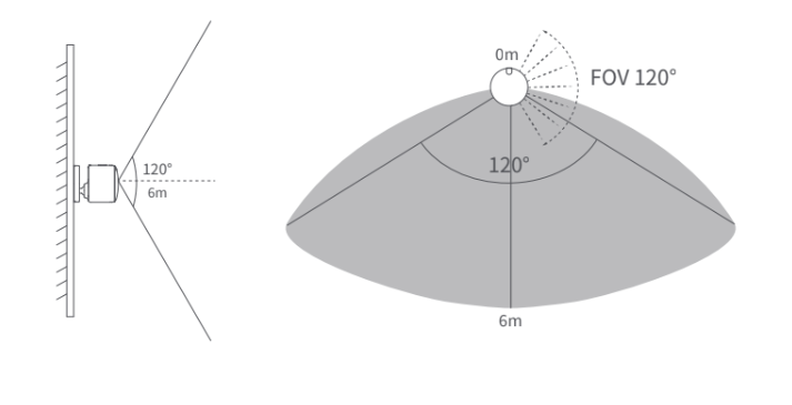 이 장치는 최대 6미터의 감지 범위와 120°의 감지 각도를 가지고 있습니다(이상적인 실험실 조건에서 측정된 수치이며, 실제 범위는 환경, 설치 높이 및 각도에 따라 약간 다를 수 있습니다. 더 넓은 각도에서는 레이더 에너지가 감소하여 최대 감지 거리가 줄어들 수 있습니다).