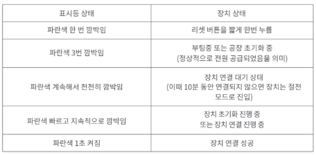 만약 네트워크 페어링이 시간 초과되었다면 LED 표시등이 깜박이기 시작할 때까지 리셋 버튼을 5초 동안 길게 눌렀다가 떼면 장치가 다시 페어링 모드로 진입합니다.