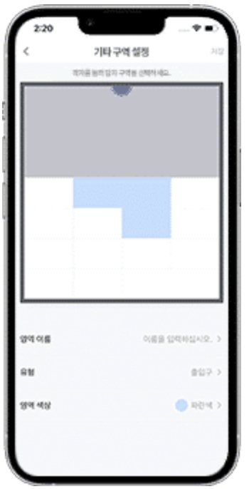 Aqara Home 메인 화면에서 장치를 설정한 후 “영역 설정”을 누르면, 감지 영역과 기타 구역을 설정할 수 있습니다. 사용 환경에 따라 화장실, 소파, 식사 공간 등 최대10개의 영역을 설정할 수 있습니다. 설정한 영역은 Aqara Home 앱에서 해당 장치를 선택하면 확인할 수 있으며 추후 편집이나 삭제가 가능하고 자동화 조건으로 사용할 수 있습니다. 또한 감지를 원하지 않는 지역에 출입구, 간섭원, 가장자리 중 하나를 설정할 수 있습니다. 간섭원을 설정하는 경우 커튼, 선풍기, 식물 등으로 움직이는 물체로 인해 발생하는 잘못된 인식을 줄일 수 있습니다. 또한 출입구와 가장자리를 미리 설정하는 경우 전파 간섭으로 인한 다중 경로 효과를 줄여 보다 정확한 감지가 가능합니다.