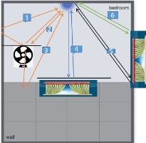 센서에서 송신한 밀리미터파가 작동중인 선풍기에 도달하면, 팬의 회전에 의해 여러 방향으로 반사되게 됩니다. 이는 오감지의 원인이 되며 선풍기의 위치를 간섭원으로 설정하여 보완할 수 있습니다. (1, 2, 3번)