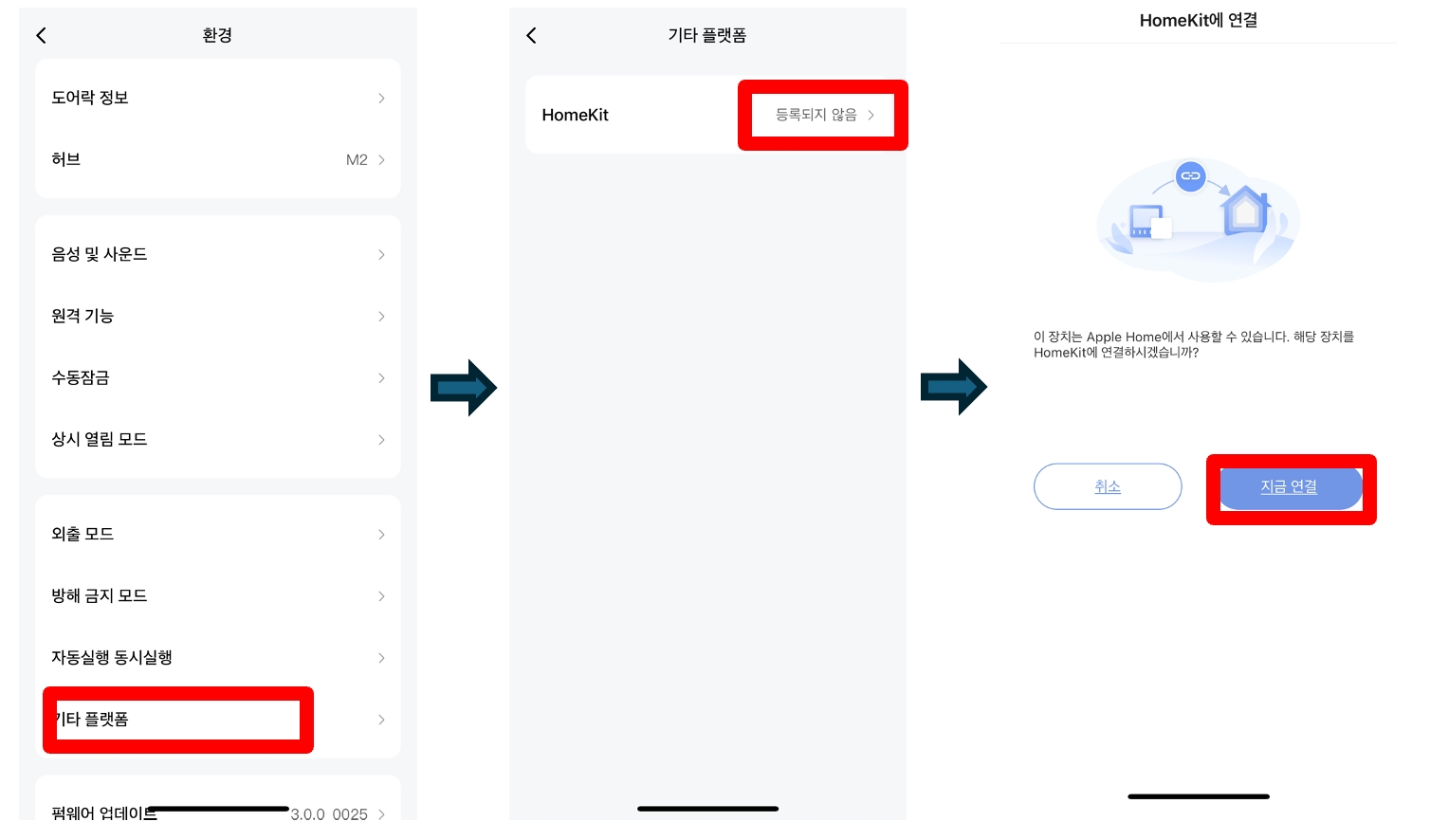 K100 도어락 메인 화면 > 우측 상단 ”…” > 기타 플랫폼 > 홈킷 등록