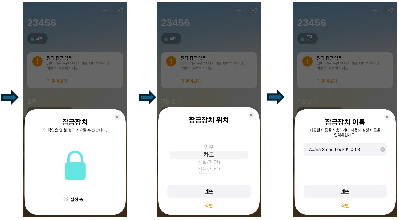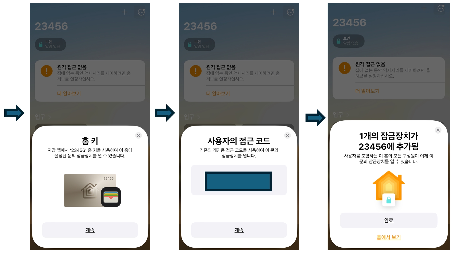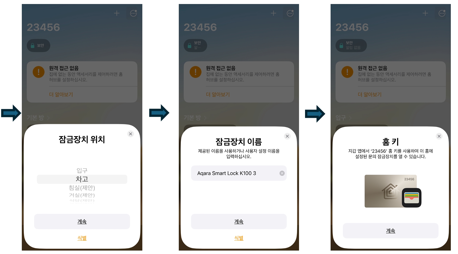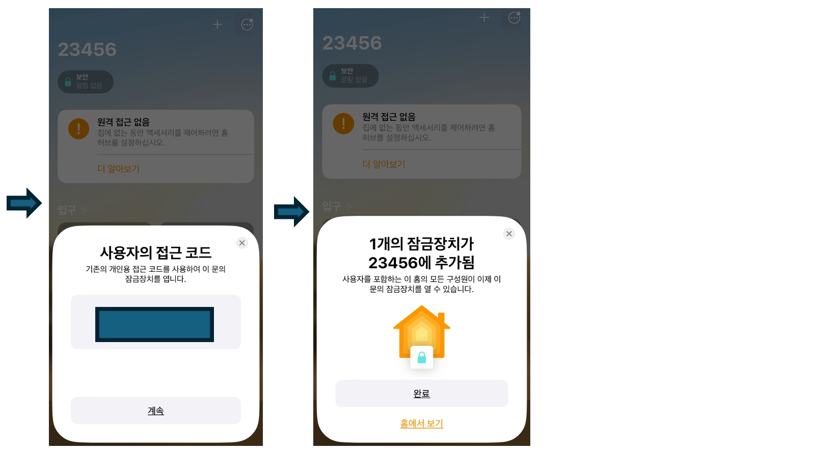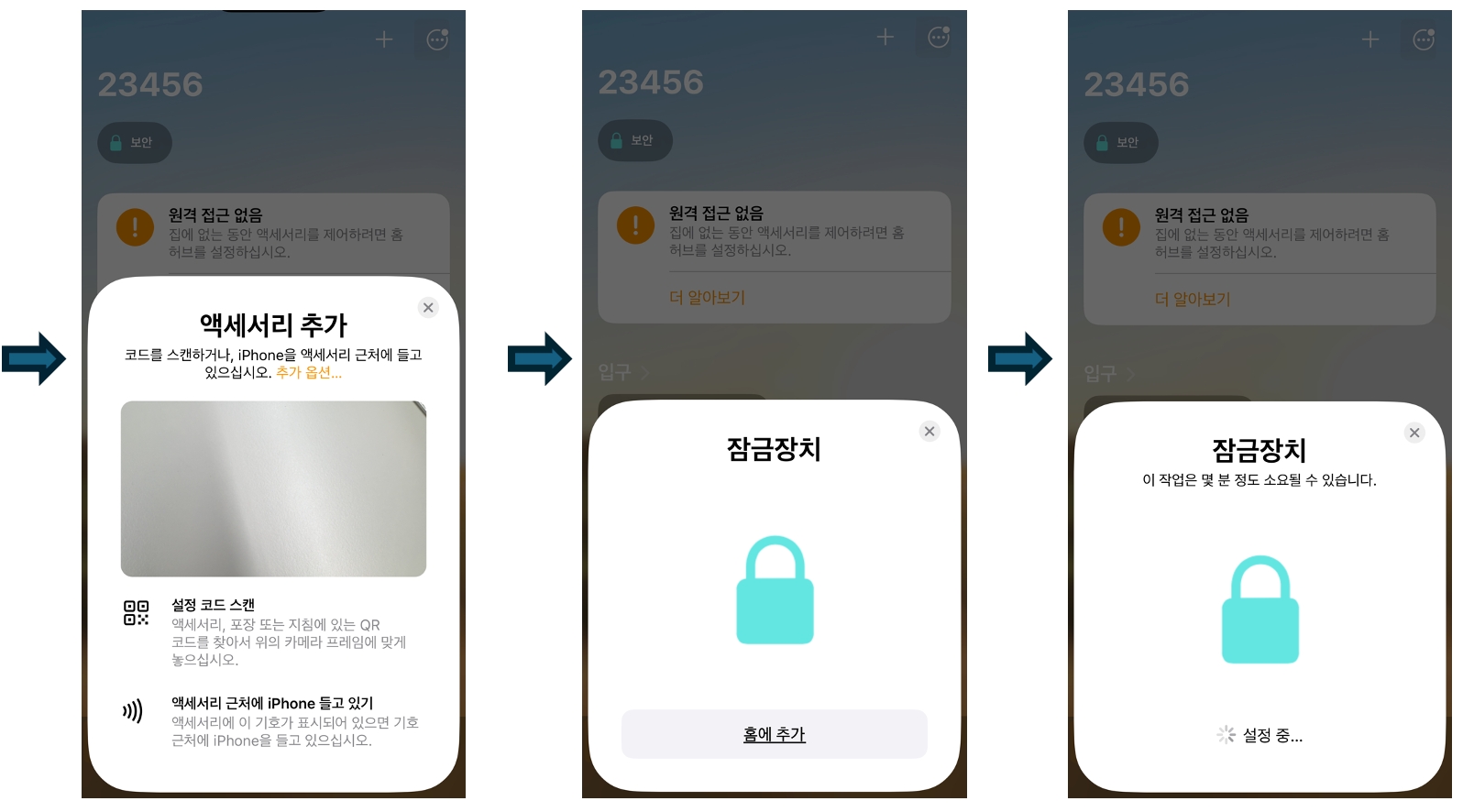 Apple Home App 안내를 따라 K100 도어락을 등록합니다.
