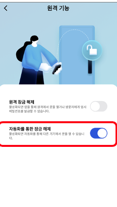 자동화를 통한 잠금 해제 기능을 활성화합니다. 이제 앱 하단 자동실행 탭에서 무선 스위치를 농한 잠금 해제 설정이 가능합니다.
