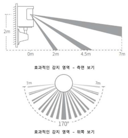 권장 설치 높이는 1.2~2m입니다. 1.2m 보다 낮으면 감지 범위가 작아집니다. 2m보다 높게 설치하면 모션센서 하단에 사각영역이 생깁니다.