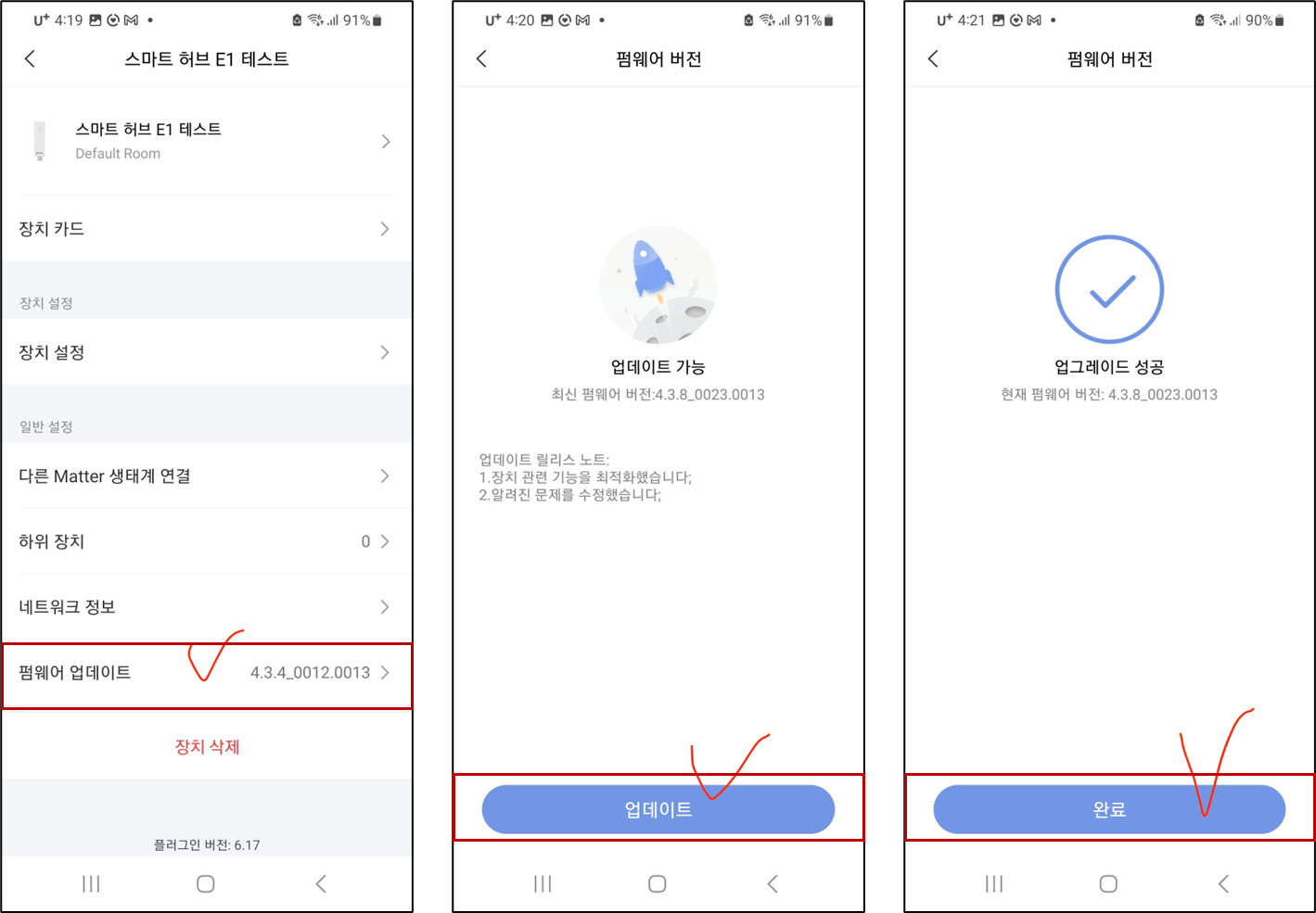 펌웨어 전송 중일 때는 화면을 반드시 유지시켜주세요. 1분 정도 기다리면 완료가 됩니다.