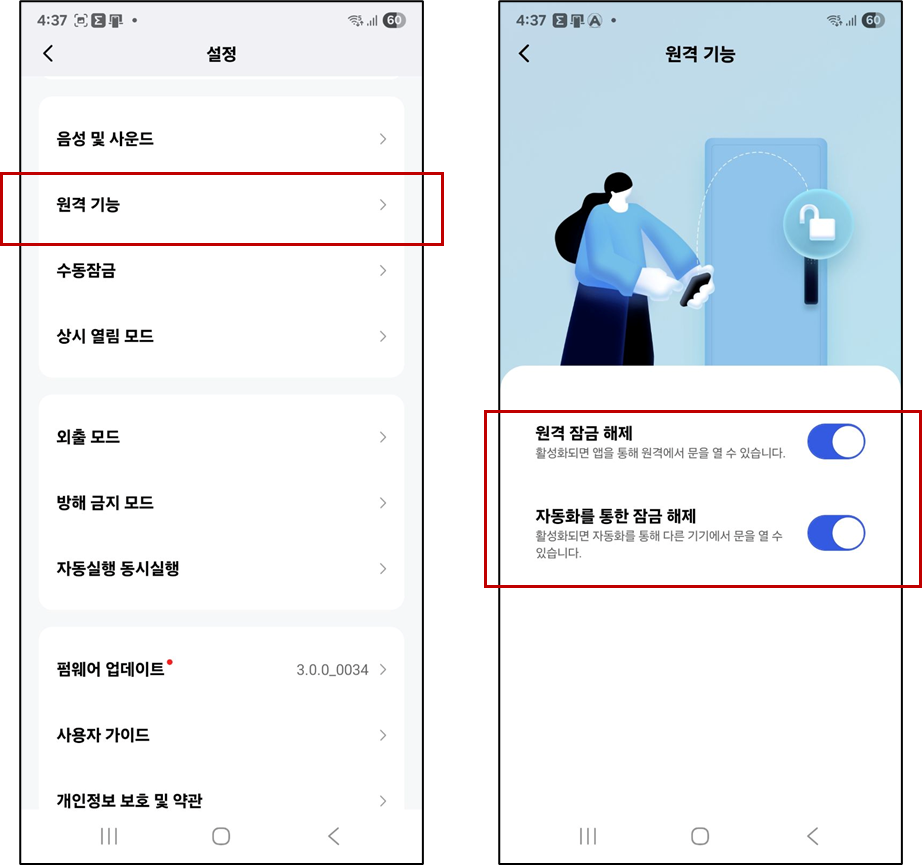 2)    이때, 원격에서 K100 도어락을 열기 위해서는 [ 앱> 장치> K100 도어락 > 우상단 … > 원격 기능> 원격 잠금 해제]에서 파랑색이 보이면 ON이 되어 있는 것입니다. 자동화를 통한 잠금 해제도 파랑색이 보이도록 ON 하세요. 그러면 W100 스위치로 도어락을 열 수 있습니다.