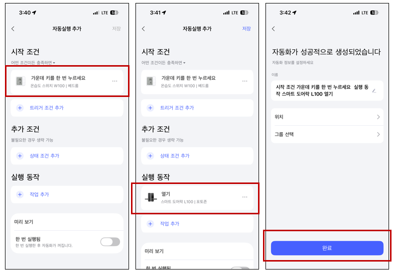 E1허브+도어락+W100온습도스위치로 문열림 설정하기