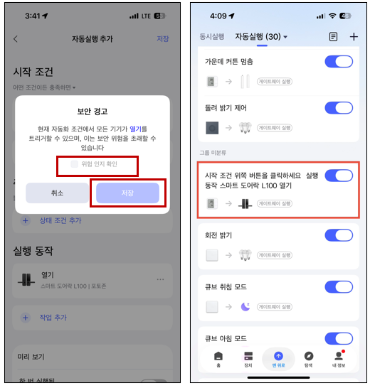3)  우상단에 있는 <저장> 버튼을 누르면, 보안 경고가 나와요. 원격에서 문을 열 수 있다는 위험을 인지하셨으면, 확인 V 누르시면, 자동화 설정이 저장됩니다.